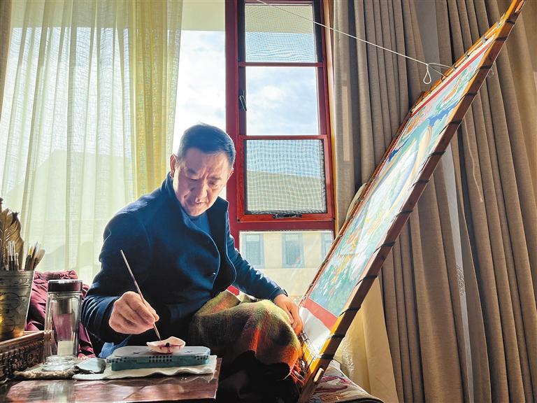 勉沖·羅布斯達(dá)在繪制唐卡。丹增平措 次旦央吉 攝