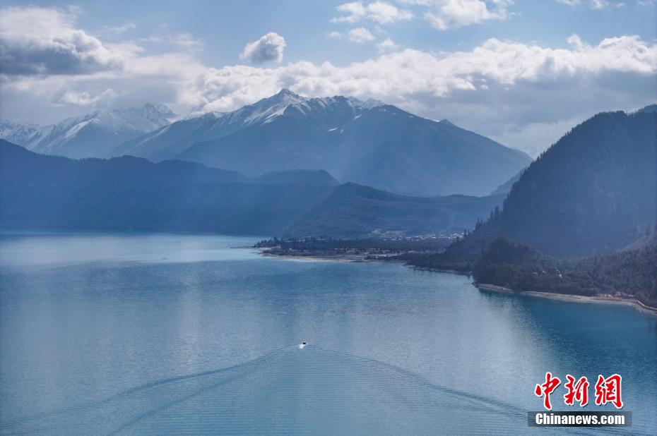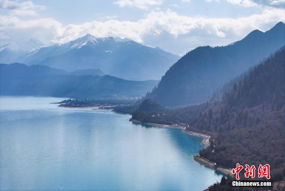 3月30日,航拍巴松措春日風(fēng)景。巴松措又名錯高湖,位于西藏自治區(qū)林芝市工布江達縣,是西藏首個自然風(fēng)景類國家5A級旅游風(fēng)景區(qū)。從空中俯瞰巴松措,碧藍的湖水被雪山、森林環(huán)繞,宛如鑲嵌在群山間的“藍寶石”。(無人機照片)中新社記者 馬銘言 攝