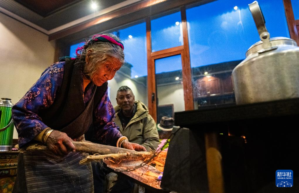 3月12日,格桑美多老人在家給火爐添柴。新華社記者 丁增尼達(dá) 攝