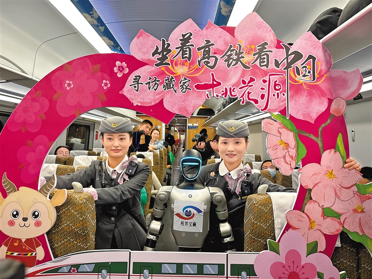 圖為拉林鐵路復(fù)興號動車組乘務(wù)員與機(jī)器人多吉合影。記者 文鳳 通訊員 馬生明 攝