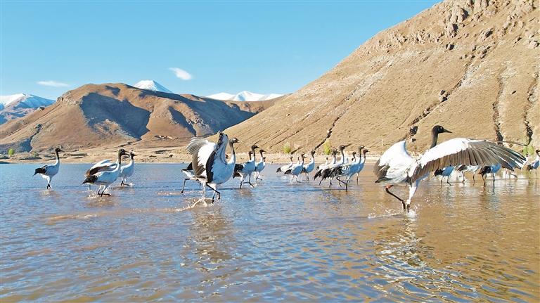 黑頸鶴在林周縣卡孜水庫(kù)嬉戲。圖片由記者 央金 林周融媒 提供