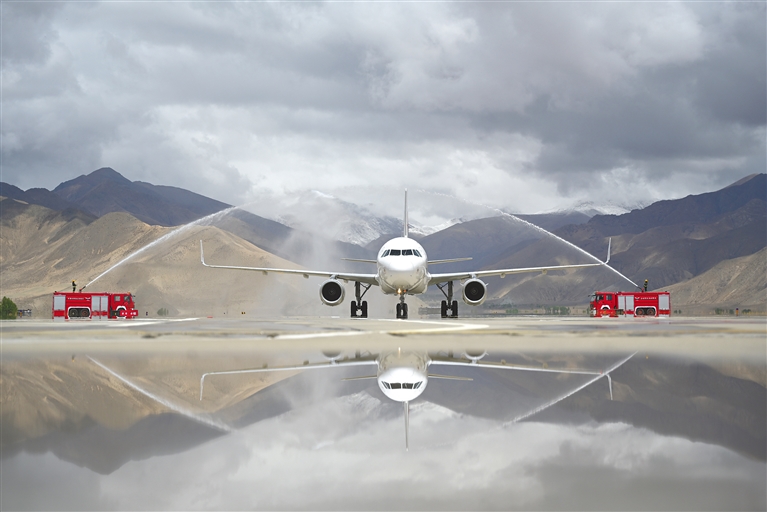 圖為5月1日,“上?!湛t”航線首航飛機在日喀則和平機場通過水門。記者 扎西頓珠 攝
