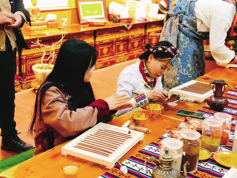 體驗(yàn)制作藏香的游客。