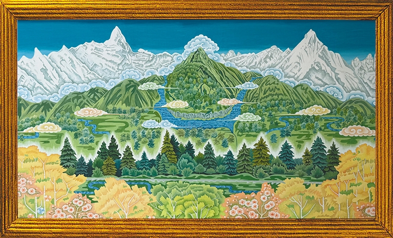 2020年,60歲的昂桑拜師一級(jí)美術(shù)師敬庭堯?qū)W習(xí)國畫,次年創(chuàng)作《雅魯藏布大峽谷》,雄渾地貌與水墨意境渾然天成。