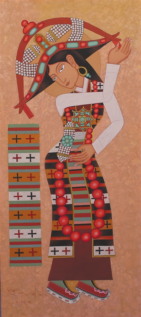 在昂?!皞鹘y(tǒng)當(dāng)隨時(shí)代”的藝術(shù)理念浸潤下,徒弟們總能在傳統(tǒng)與當(dāng)代的碰撞中找到獨(dú)特的表達(dá)坐標(biāo):來自日喀則的藝術(shù)家多吉次旺,早年被昂桑畫作中藏文元素與抽象色塊的融合所震撼。如今在拉薩創(chuàng)辦工作室的他,正將藏文書法的中鋒筆觸解構(gòu)為流動(dòng)的視覺符號(hào)——烏金體的頓挫韻律幻化為色彩的潮涌,在畫布上重現(xiàn)古老史詩的“當(dāng)代心跳”;而主演《文成公主》實(shí)景劇的馮佳,這位四川傳媒大學(xué)表演系的畢業(yè)生,跟隨昂桑學(xué)畫四年,已能在《文成公主》系列中將唐卡礦物顏料的莊重與波普藝術(shù)的色塊切割并置,讓歷史人物既保有壁畫般的莊重感,又流淌著屬于時(shí)代的視覺節(jié)奏。
