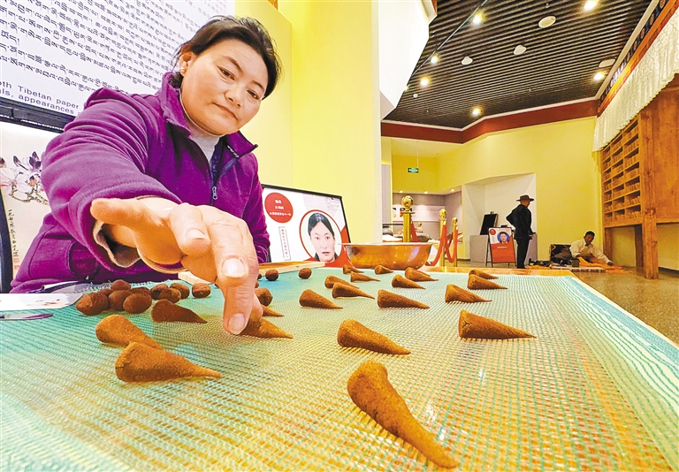 藏香制作非遺傳承人邊巴在西藏非物質(zhì)文化遺產(chǎn)博物館現(xiàn)場制作藏香。