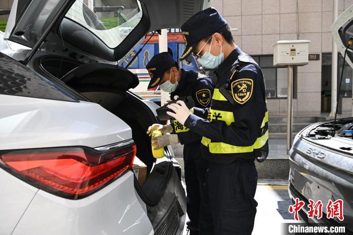圖為西藏自治區(qū)日喀則市吉隆縣的吉隆口岸,海關(guān)工作人員在對出口的國產(chǎn)新能源汽車進行檢查。貢嘎來松 攝