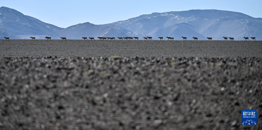 在羌塘國家級(jí)自然保護(hù)區(qū)核心區(qū)拍攝的遷徙中的雌性藏羚羊群(6月8日攝)。新華社記者 旦增尼瑪曲珠 攝