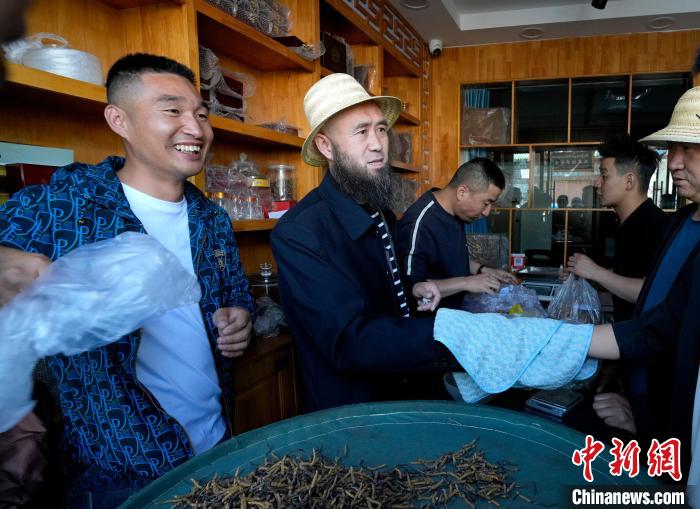 圖為6月13日,蟲(chóng)草商通過(guò)揣袖議價(jià)的方式購(gòu)買(mǎi)冬蟲(chóng)夏草。中新社記者 李林 攝