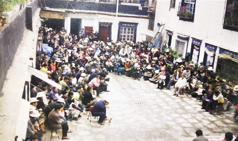 在當(dāng)時拍的另一張照片上,幾十位居民擠在過道里準(zhǔn)備投票。“那時候院子小,選舉時得側(cè)著身子站?!钡录扛禄貞浀溃霸鹤诱?,雨天積水,但絲毫不影響大家參與社區(qū)事務(wù)的熱情?!闭掌囊唤牵?3歲的普布普赤正躲在母親身后好奇張望,如今她41歲,已成長為大院的戶長。