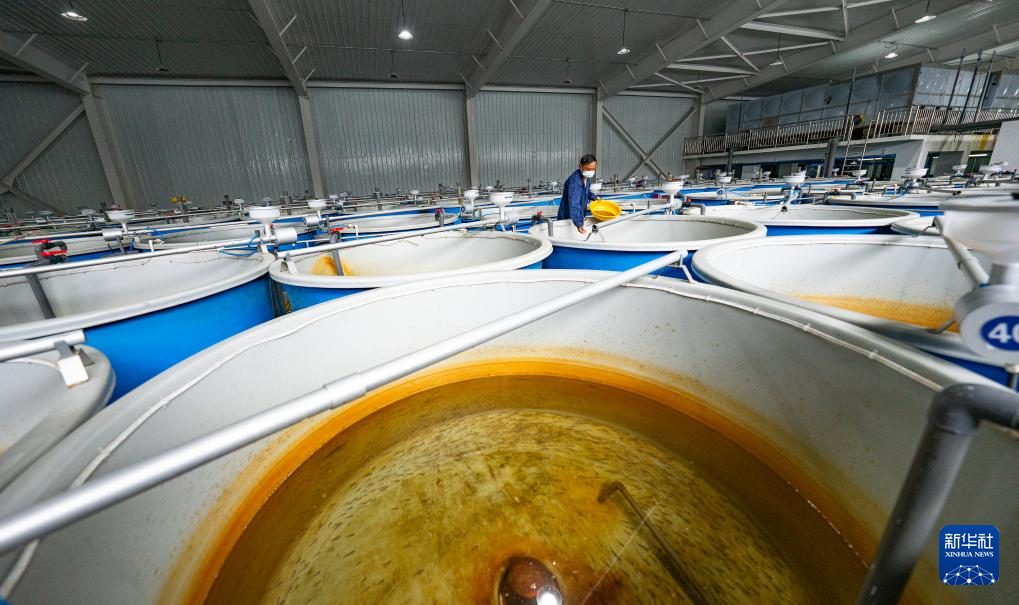 工作人員在育苗車間給亞?wèn)|鮭魚魚苗喂食(6月19日攝)。新華社記者 丁增尼達(dá) 攝