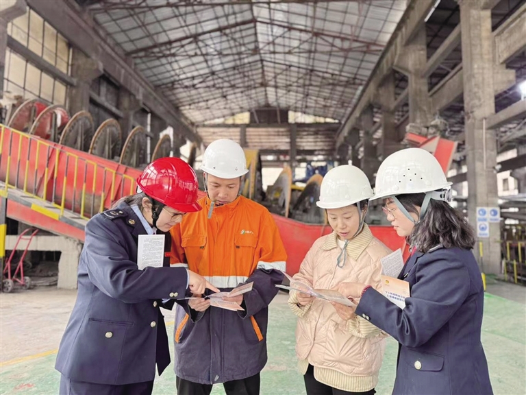 稅務(wù)工作人員在礦山企業(yè)生產(chǎn)經(jīng)營場所開展稅費宣傳。圖由自治區(qū)稅務(wù)局提供