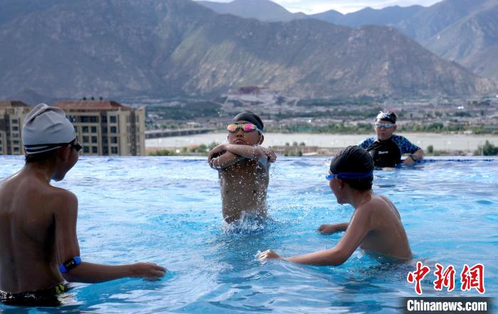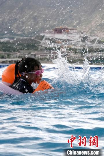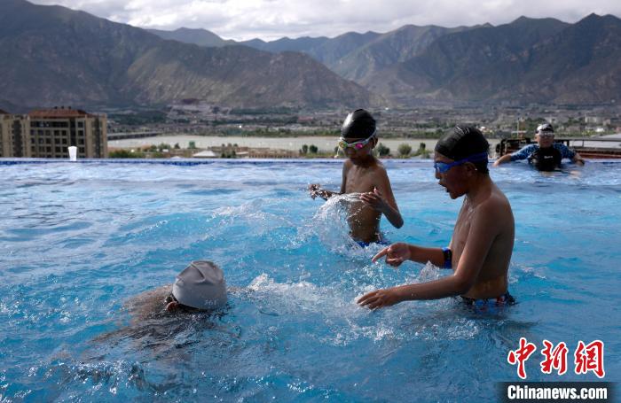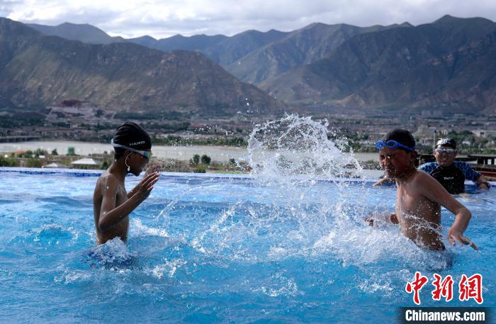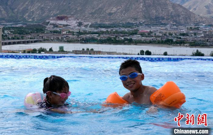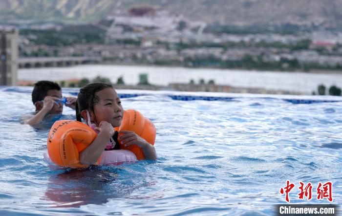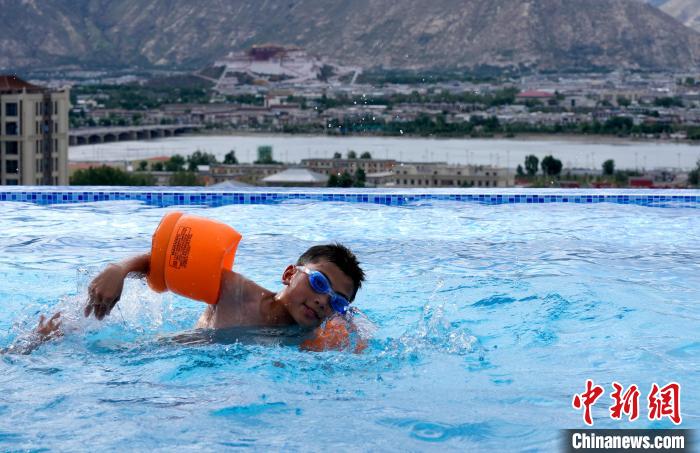 7月5日,西藏拉薩市一泳池內(nèi),不少市民帶著孩子來(lái)到泳池戲水,享受夏日清涼。圖為小朋友在泳池里游泳。中新社記者 李林 攝