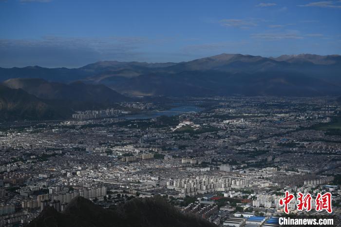 7月5日清晨,西藏拉薩市在薄霧中朦朧蘇醒,天際線泛起粉紫色霞光。布達拉宮在朝陽的映照下美景如畫。中新社記者 貢嘎來松 攝