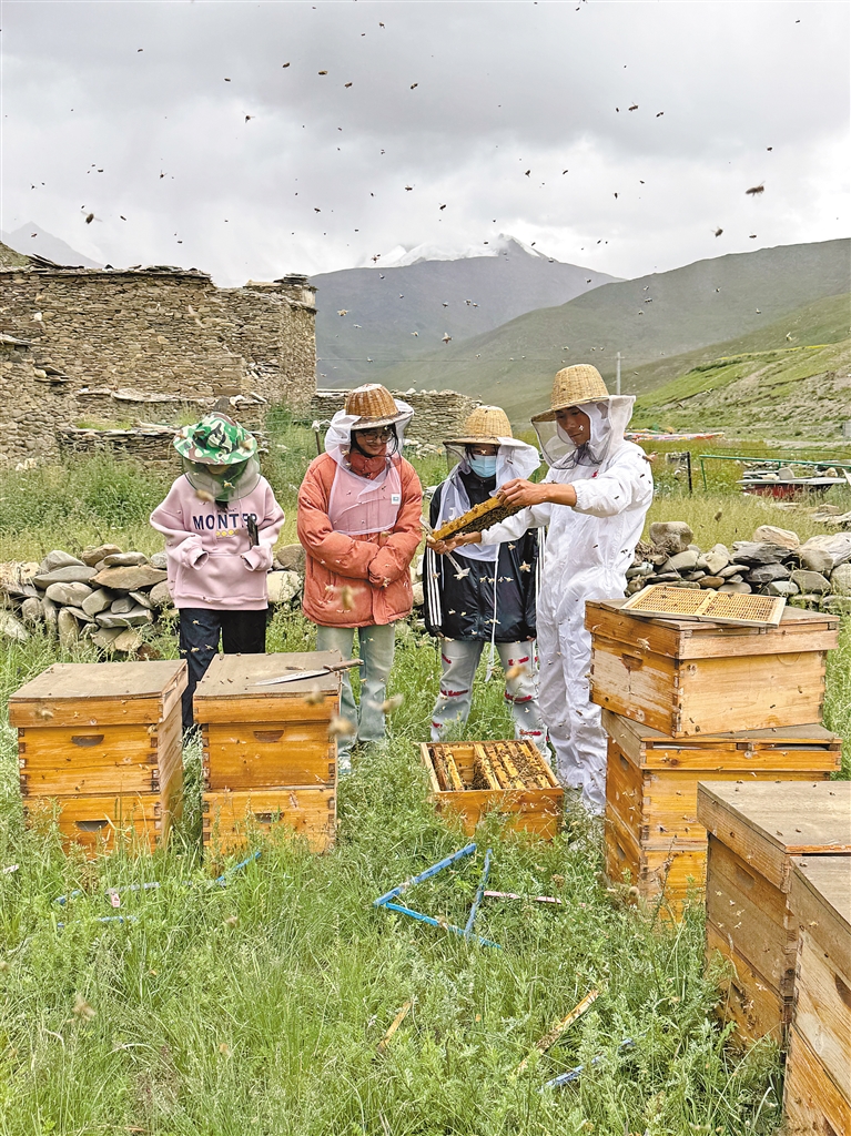 “蜂”產(chǎn)業(yè)激活鄉(xiāng)村振興“甜蜜動(dòng)能”。走進(jìn)卡珠村的德康瓦蜜蜂養(yǎng)殖專業(yè)合作社養(yǎng)殖基地,一排排蜂箱整齊擺放,成群的蜜蜂穿梭在花叢間,振翅的嗡嗡聲交織成一曲熱鬧的豐收曲。負(fù)責(zé)人尼瑪桑旦,一位返鄉(xiāng)創(chuàng)業(yè)的95后大學(xué)生,正帶領(lǐng)員工們忙碌著:“我們創(chuàng)立了‘阿媽準(zhǔn)’藏蜜品牌,也在銷售風(fēng)干牛肉、人參果、蕁麻草等特色產(chǎn)品,通過電商平臺(tái),我們的‘哲古味’已經(jīng)賣到了全國(guó)。去年銷售額突破了115萬(wàn)元,還帶動(dòng)了周邊10多戶群眾增收致富?!边@間小小的加工坊,正是哲古鎮(zhèn)推動(dòng)傳統(tǒng)產(chǎn)業(yè)與現(xiàn)代市場(chǎng)接軌的生動(dòng)縮影。
