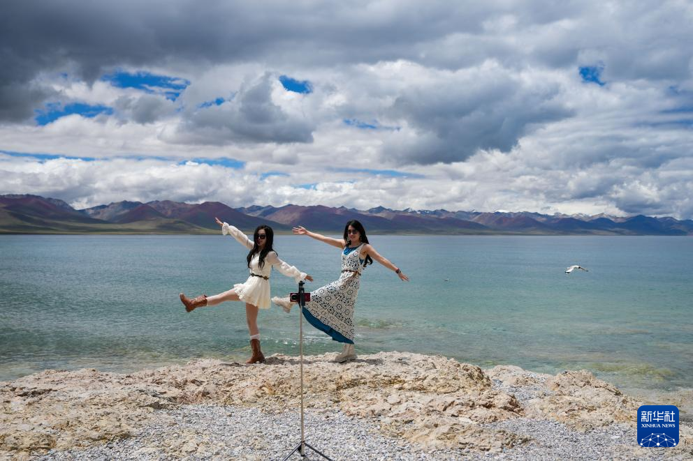 7月16日,兩名游客在納木錯湖邊自拍。新華社記者 晉美多吉 攝