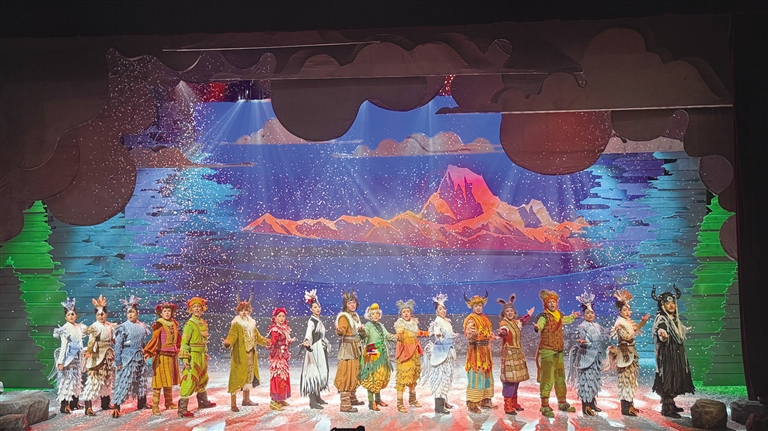 在《高原上的精靈》舞臺上,西藏傳統(tǒng)樂器的韻律與生態(tài)寓言相互交織。當弦子、鷹笛和扎念琴的聲音劃破夜空時,小觀眾們已沉浸其中。藏戲溫巴的藍面具在聚光燈下浮現(xiàn),藏戲特有的說唱調(diào)式如雪山融水般流淌……《高原上的精靈》以80分鐘的音樂劇形式突破傳統(tǒng)話劇的敘事框架,這種形式選擇源于深刻的兒童心理洞察——音樂劇特有的歌舞敘事能持續(xù)刺激視覺與聽覺神經(jīng),避免低齡觀眾對純對白場景產(chǎn)生倦怠感。