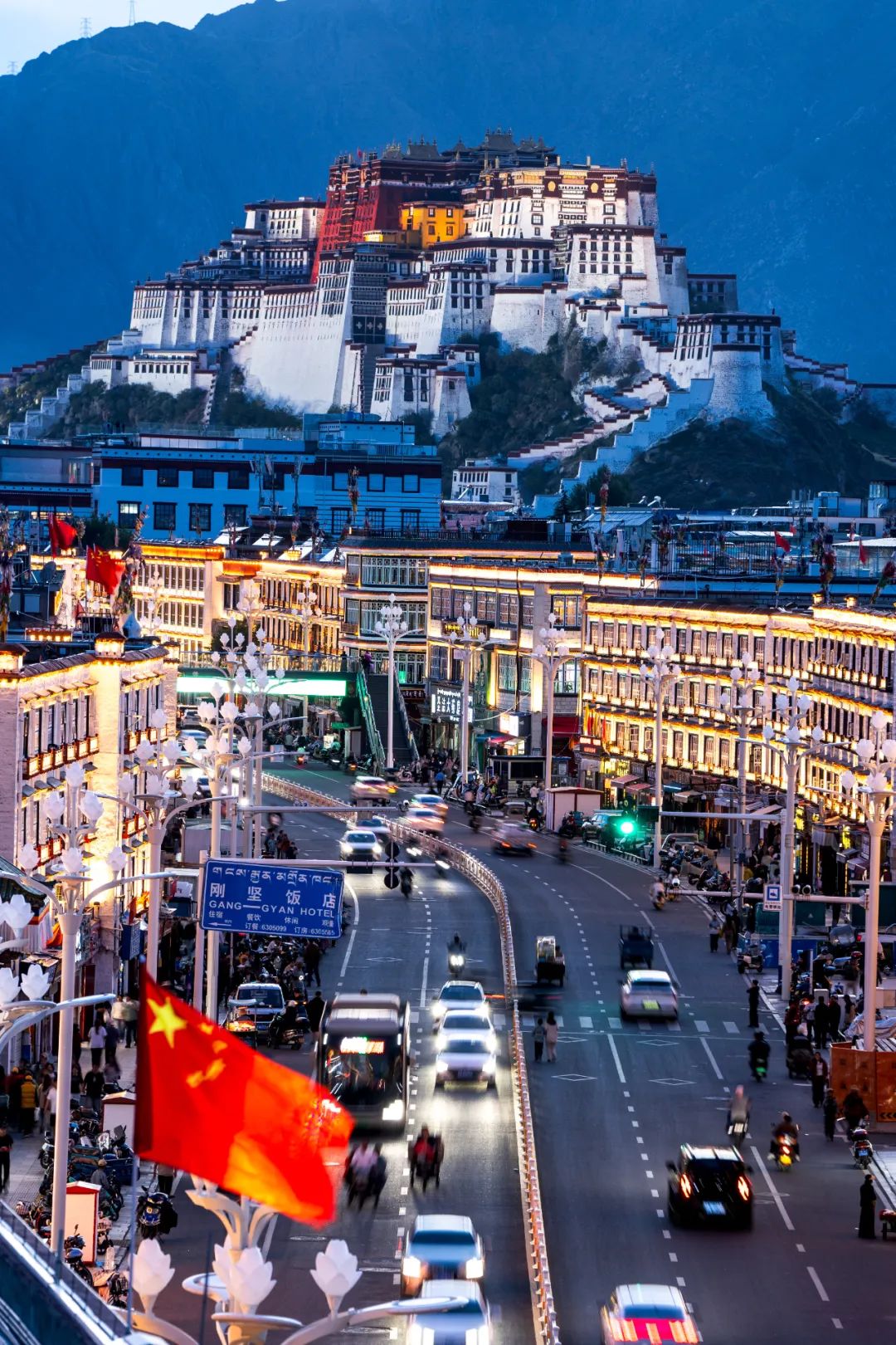 7月14日晚,在西藏拉薩,亮燈后的布達拉宮與北京東路交相輝映,夜色璀璨奪目。