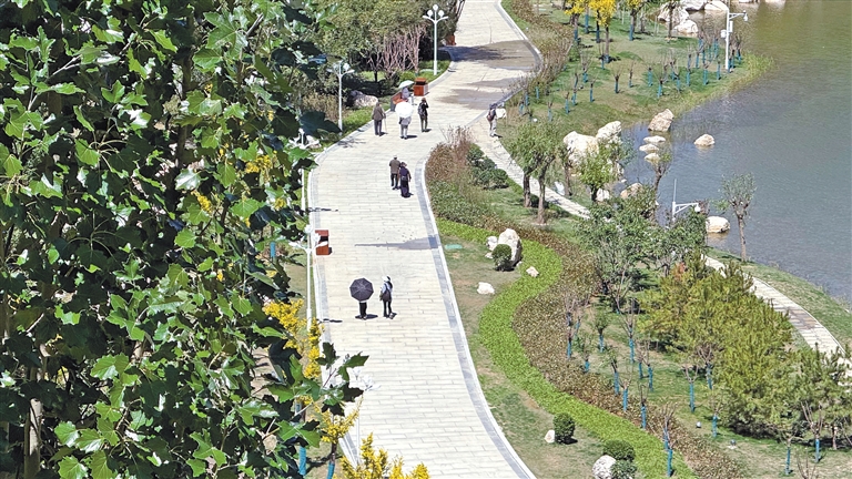 如今,湖水如碧綢般清澈,岸邊綠樹(shù)成蔭,各類花卉競(jìng)相綻放。昔日雜亂之地已蛻變?yōu)榫用裥蓍e納涼的好去處。人文古跡與自然景致相映成趣,共同繪就出“百澤繞城·水城相依”的生態(tài)文明畫(huà)卷。