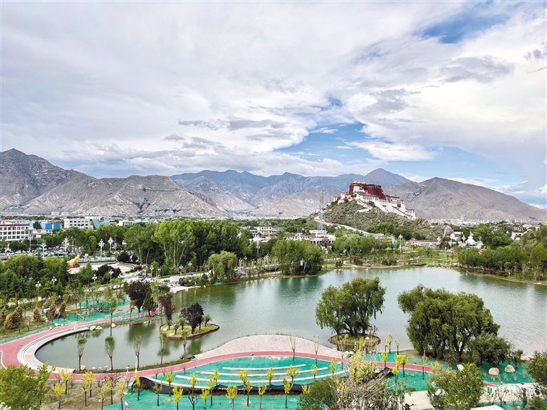 站在藥王山觀景臺(tái)眺望,重獲新生的水系如綠色飄帶擁抱著布達(dá)拉宮。
