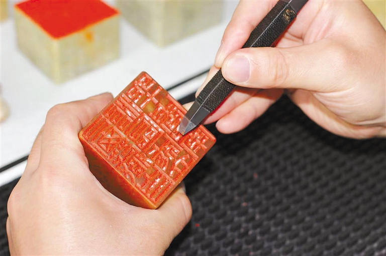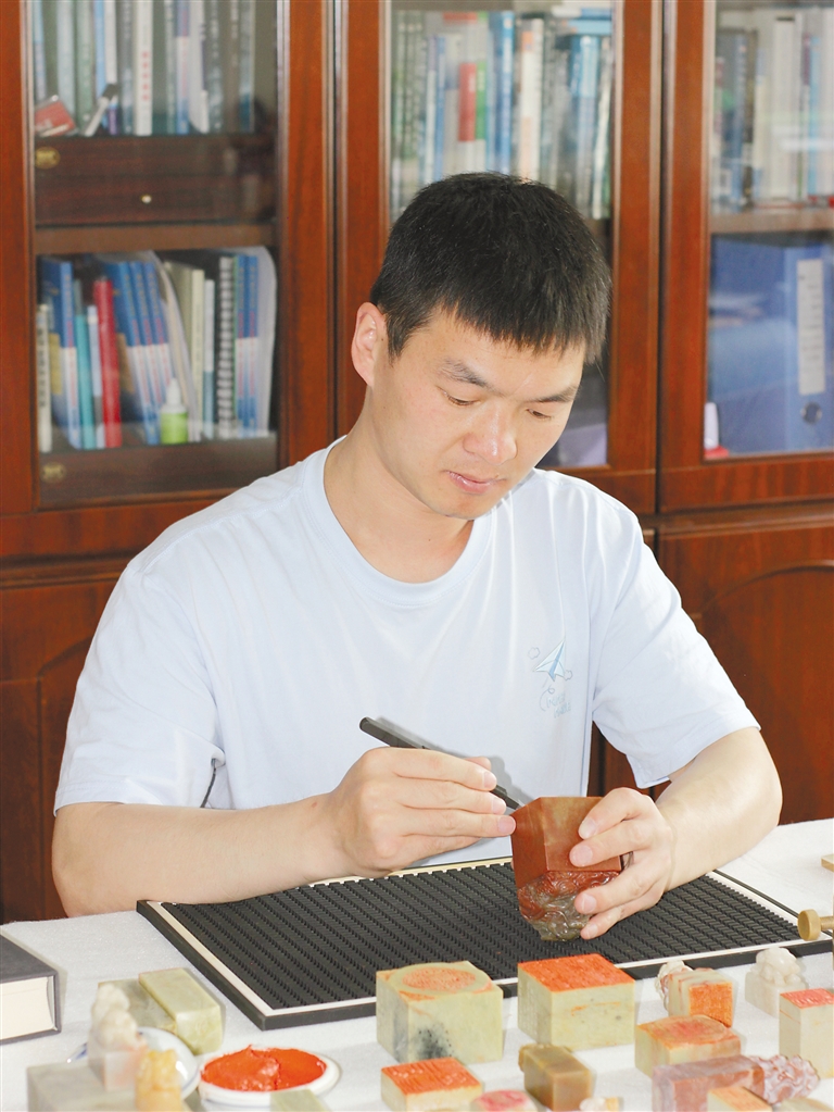 徐帥正認(rèn)真篆刻作品。