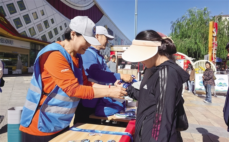 志愿者為市民系上象征保護(hù)生態(tài)環(huán)境的藍(lán)絲帶。