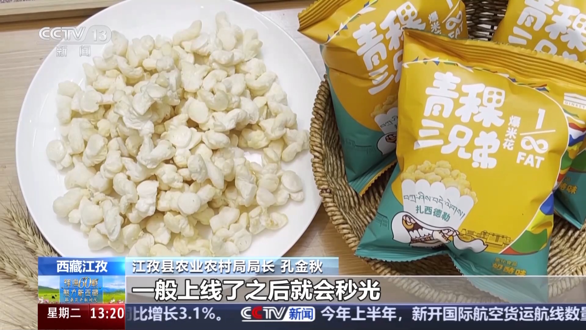 江孜縣農(nóng)業(yè)農(nóng)村局局長 孔金秋:像這個(gè)青稞爆米花,麻森這些產(chǎn)品在線上都非常受歡迎,一般上線了之后就會(huì)秒光,我們現(xiàn)在通過企業(yè)加合作社加農(nóng)戶的這種發(fā)展模式,已經(jīng)實(shí)現(xiàn)了青稞原料訂單7000噸,預(yù)計(jì)今年能夠?qū)崿F(xiàn)1.5萬噸,青稞深加工產(chǎn)業(yè)的這個(gè)總產(chǎn)值預(yù)計(jì)突破1.7億元,同比增長21%。