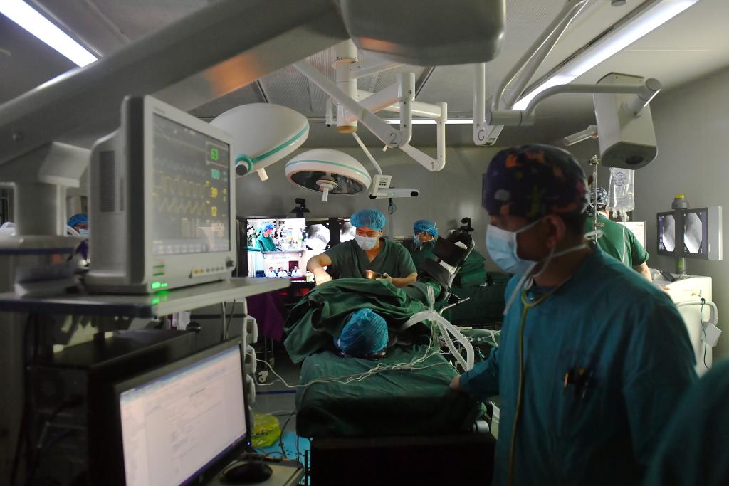 2021年4月19日,拉薩市人民醫(yī)院骨科醫(yī)生在北京積水潭醫(yī)院專家遠(yuǎn)程指導(dǎo)下使用骨科機器人開展骨科手術(shù)。 新華社記者 孫瑞博 攝
