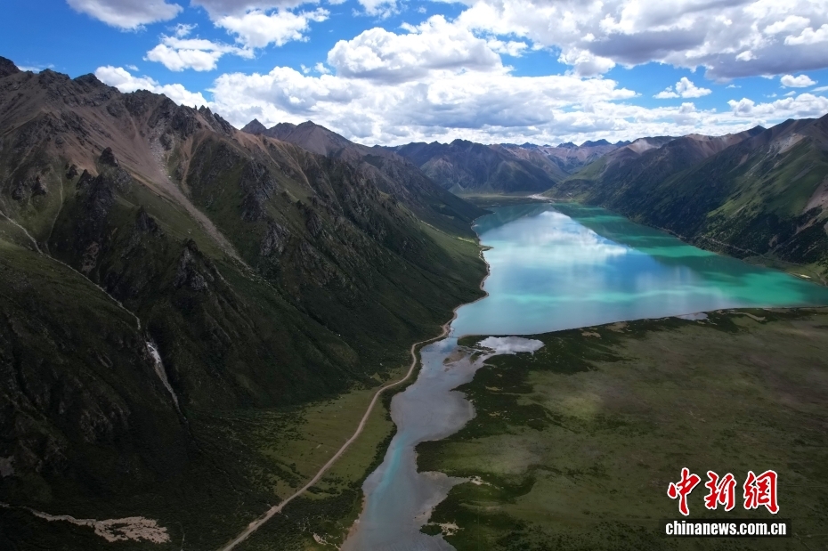 西藏那曲市,嘉乃玉錯(cuò)國家濕地公園碧波蕩漾,湖邊綠意盎然,在藍(lán)天白云映襯下,景色如畫。(無人機(jī)照片)中新社記者 李林 攝