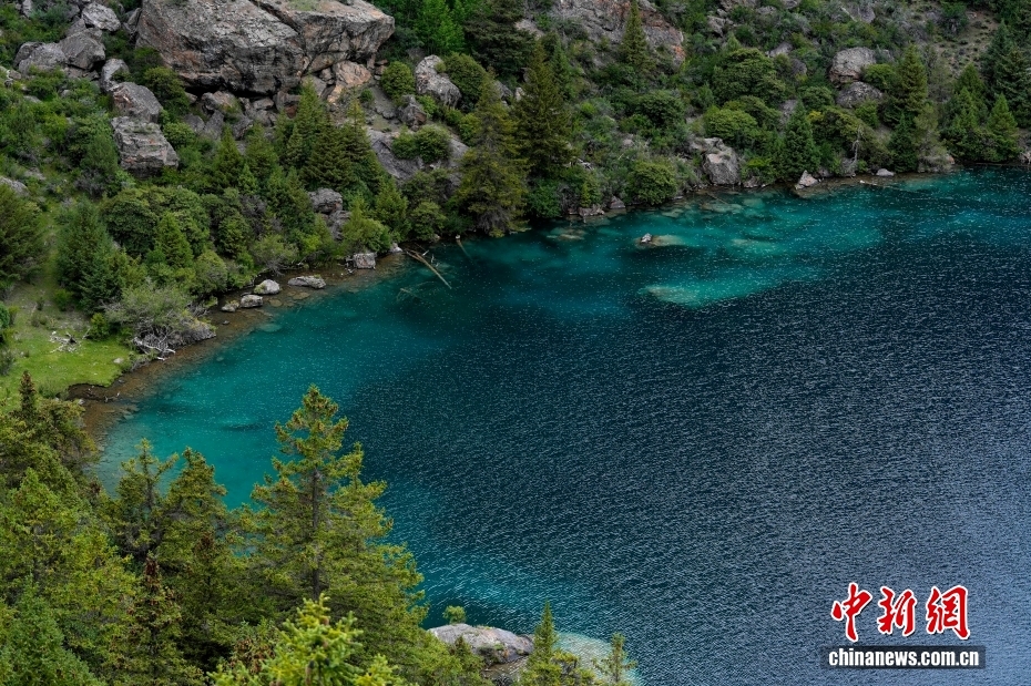 俯瞰西藏昌都三色湖風(fēng)光。三色湖位于西藏昌都邊壩縣普玉村境內(nèi)。夏日,三色湖周邊郁郁蔥蔥,景色秀麗。中新社記者 李林 攝
