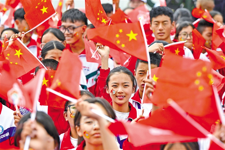群眾在慶祝大會(huì)現(xiàn)場(chǎng)揮舞旗幟。新華社記者 申宏 攝