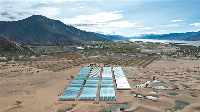 位于扎囊縣的國家農業(yè)產業(yè)化示范企業(yè)——西藏綠之源現代農業(yè)科技股份有限公司二期項目,如同一片“綠洲”鑲嵌在沙丘之中。記者 丹增平措 攝