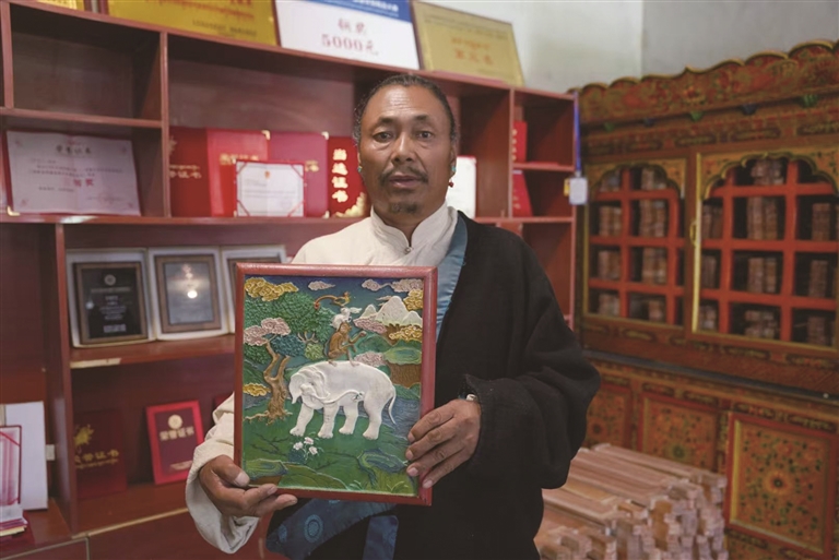 “‘酒香也怕巷子深’,以前普松雕刻這門手藝雖然精湛,但由于缺乏有效的宣傳推廣途徑,知曉的人并不多,產(chǎn)品銷售渠道也比較狹窄,只能靠少量的定制訂單維持?,F(xiàn)在旅游‘火’起來了,游客多起來了,越來越多的人有機會近距離接觸到普松雕刻的精美作品,產(chǎn)生了濃厚的興趣,生意也越來越好了。”斯曲說。
