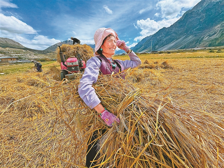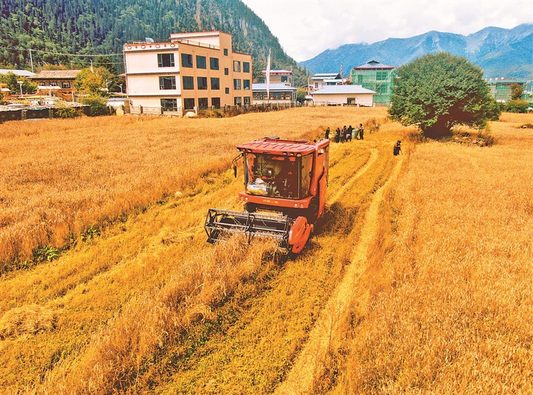 在拉薩市墨竹工卡縣唐加鄉(xiāng)莫沖村,田間地頭繁忙景象撲面而來(lái)。幾臺(tái)大型收割機(jī)轟鳴著在金色的農(nóng)田里來(lái)回穿梭,收割、脫粒一氣呵成,村民們跟在機(jī)器后方,有條不紊地進(jìn)行后續(xù)整理工作,呈現(xiàn)出一派熱火朝天的豐收?qǐng)鼍?。村民貢嘎頓玉向記者介紹,“我家共有37畝農(nóng)田,10畝種小油菜,27畝種青稞。以前全家4口上陣得忙上一個(gè)多月,現(xiàn)在有了機(jī)械化作業(yè),短短幾天就能完成所有秋收工作,既省時(shí)又省力。”