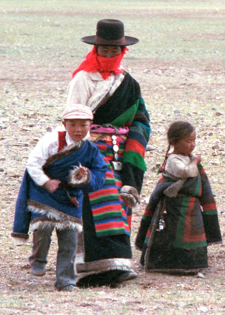 1987年,在西藏那曲地區(qū)文部辦事處(現(xiàn)那曲市尼瑪縣)賽馬會上,小男孩次仁石達(dá)(左一)和她阿媽達(dá)曲(中)在一起。新華社記者 唐召明 攝