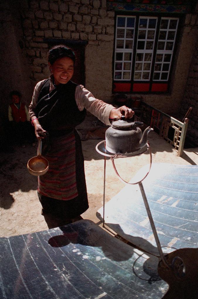 西藏江孜縣,次仁玉珍使用太陽能灶燒開水。這種太陽能灶十多分鐘就可以燒開一壺水,既省時、省力,又方便。 (1997年10月13日發(fā))