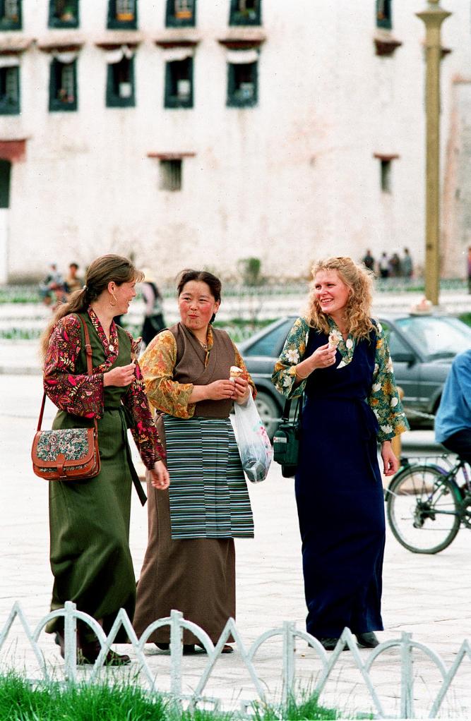 在拉薩市布達(dá)拉宮前,兩位身著藏裝的外國游客和一位藏族婦女交談。交通和旅游服務(wù)設(shè)施的逐步完善,為獨具風(fēng)情的西藏高原引來了更多的游客。(1997年11月13日發(fā))