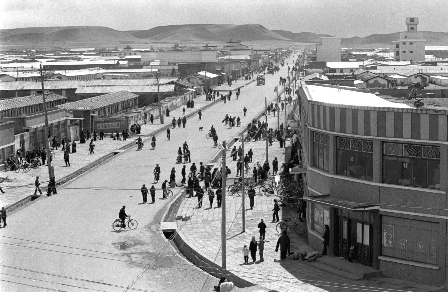 連接西藏和內(nèi)地的交通大動脈青藏公路的修筑和暢通,給西藏的經(jīng)濟發(fā)展帶來了巨大的變化。圖為1987年青藏公路線上的西藏那曲鎮(zhèn)。