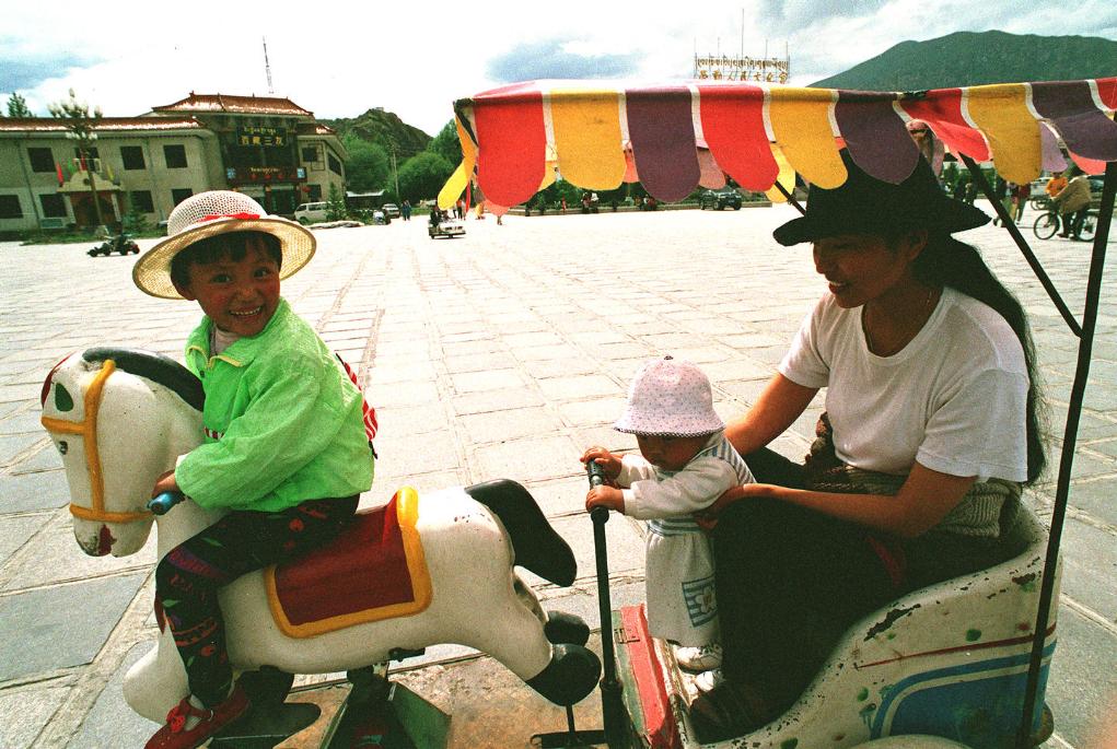 在拉薩市布達(dá)拉宮廣場,這家藏族母女三人在乘坐兒童電動車游玩娛樂(1997年11月13日發(fā))。