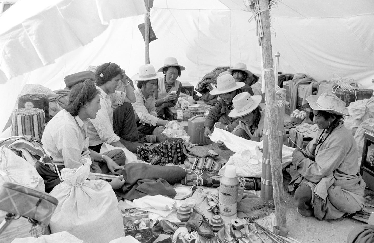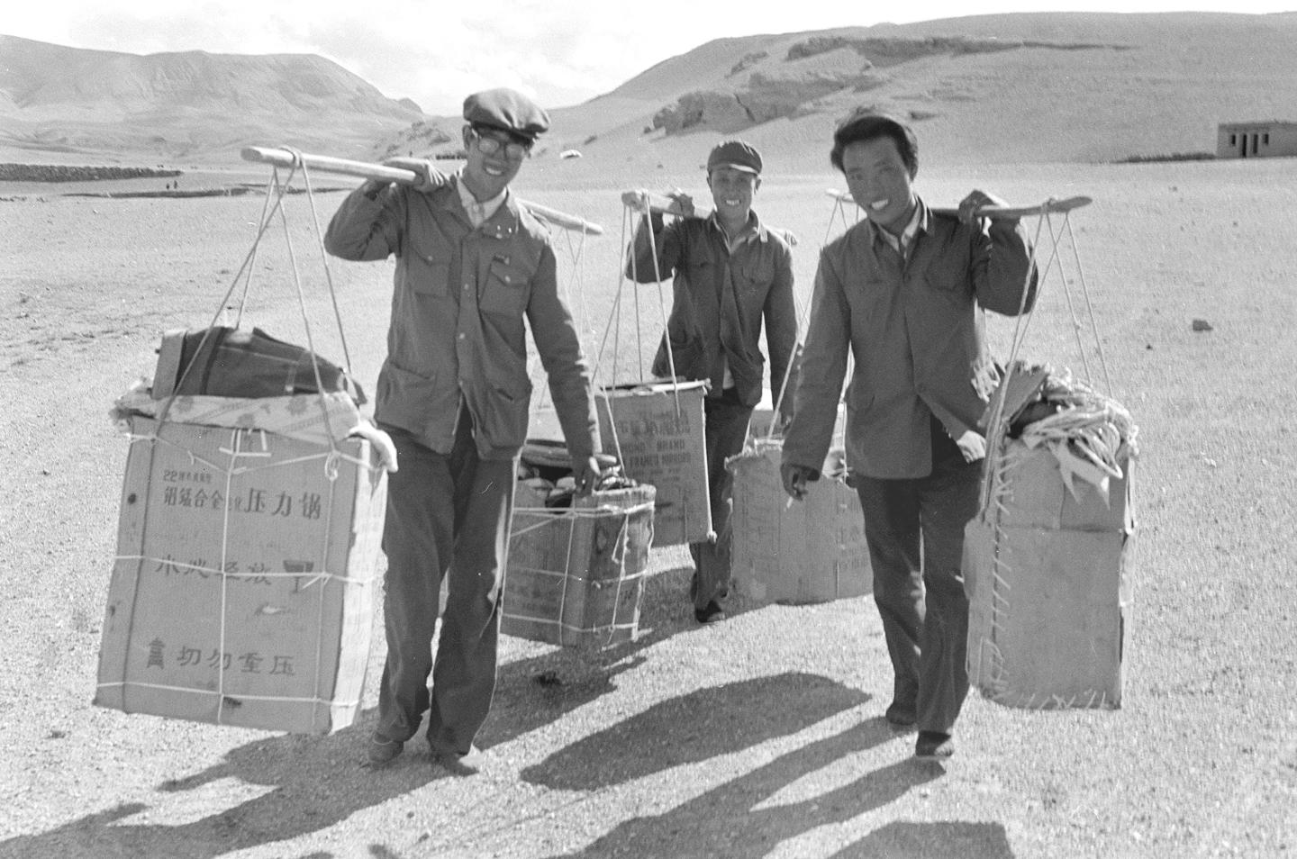隨著“無人區(qū)”的開發(fā)建設(shè),在這亙古荒原迎來了內(nèi)地貨郎擔(dān)。這是來自甘肅省秦安縣興豐鄉(xiāng)的三位農(nóng)民肩挑商品來到海拔5000米的文部草原出售商品(1987年9月16日發(fā))。