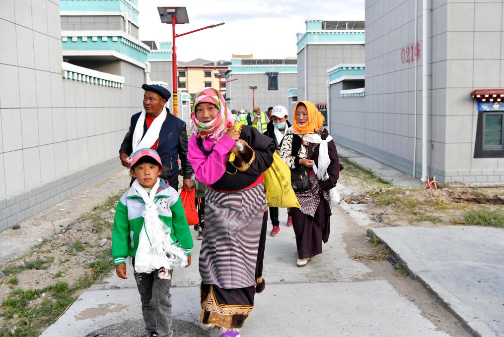 剛剛抵達(dá)森布日安置點的雙湖縣牧民正前往新家(2022年7月19日攝)。新華社記者 張汝鋒 攝