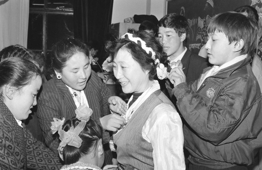 北京市西藏中學(xué)600多名高原兒女歡度藏歷水猴年新春佳節(jié)。預(yù)科二班的藏族中學(xué)生給他們的“張媽媽”——班主任張榮安老師穿上藏裝,共慶這歡樂時刻(1992年3月5日攝)。
