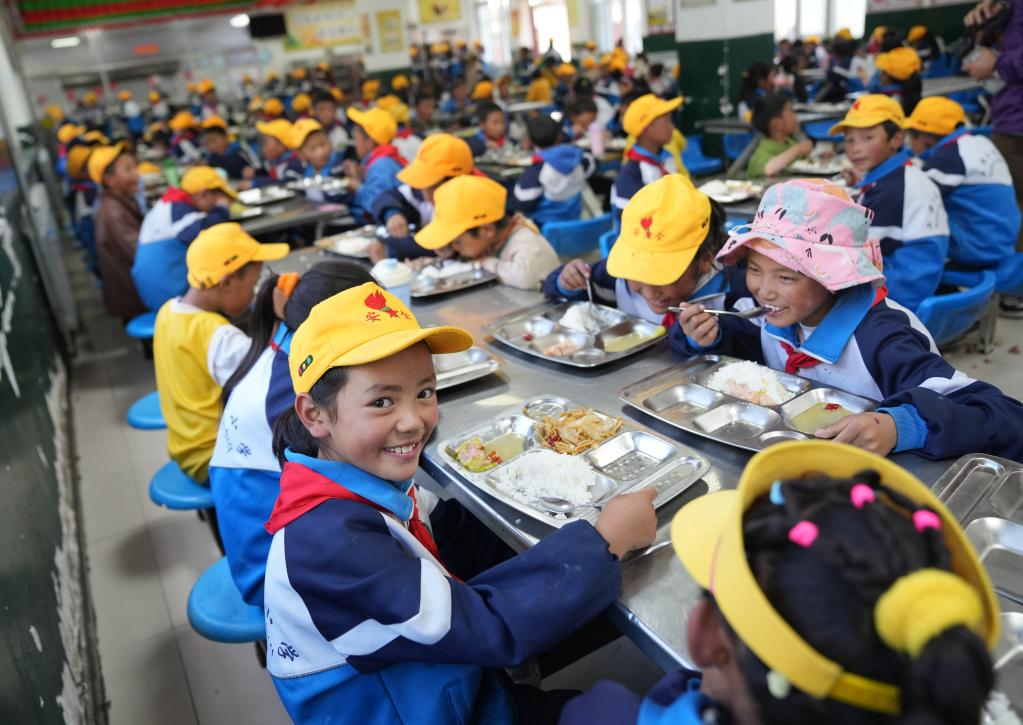 西藏林芝市工布江達(dá)縣娘蒲鄉(xiāng)中心小學(xué)學(xué)生在食堂用餐(2024年9月3日攝)。 新華社記者 晉美多吉 攝
