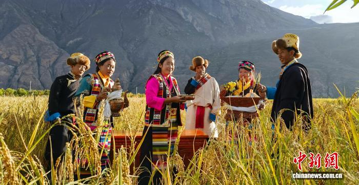 豐收現(xiàn)場(chǎng),共康村村民紛紛向范春捆獻(xiàn)上青稞酒致謝,隨后村民們邊唱祝福歌曲邊用傳統(tǒng)鐮刀手工收割。為了提高收割效率,范春捆從山南市區(qū)專門定了一臺(tái)收割機(jī),幫助村民收割水稻。
