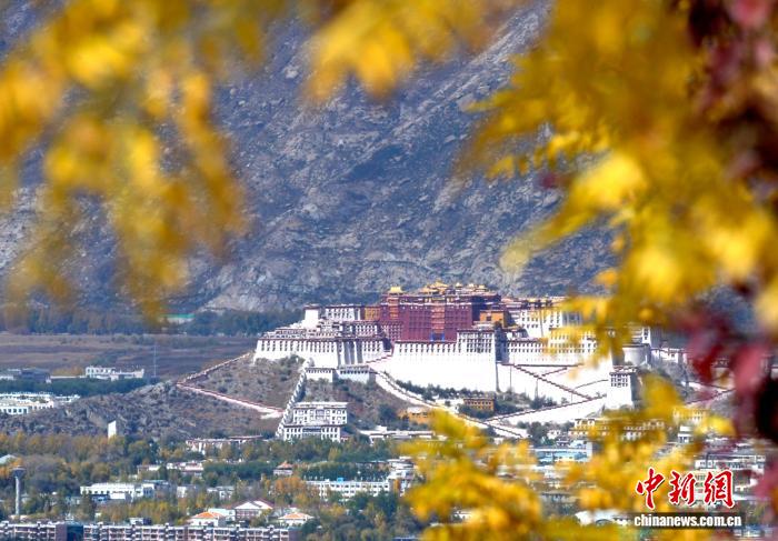 10月20日,西藏拉薩深秋如畫。圖為拉薩天堂草原自然風景區(qū)的黃葉與布達拉宮相映成趣。中新社記者 李林 攝