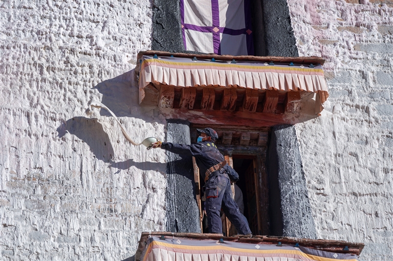 不遠(yuǎn)處,安全繩在布達(dá)拉宮白色的墻壁上勾勒出利落的線條。工匠拿著長刷柄和噴槍,正仔細(xì)地粉刷著墻壁的各個角落。陽光刺眼,卻絲毫不影響他們手中利落的動作。
