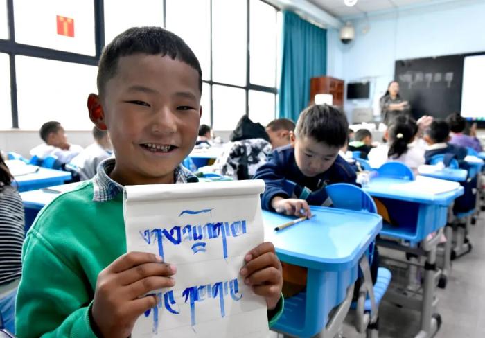 2024年8月20日,拉薩市第一小學(xué)一年級(jí)八班迎來藏語文課。圖為學(xué)生展示書寫的藏文。中新社記者 李林 攝