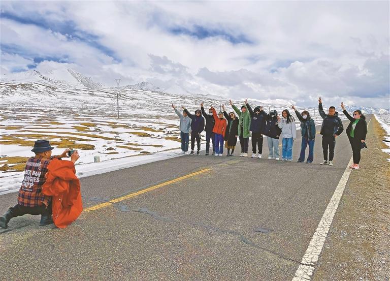 在山南市桑日縣貢德林草原,游客在雪地公路合影,記錄高原冬日氛圍。記者 白瑪澤旺 攝