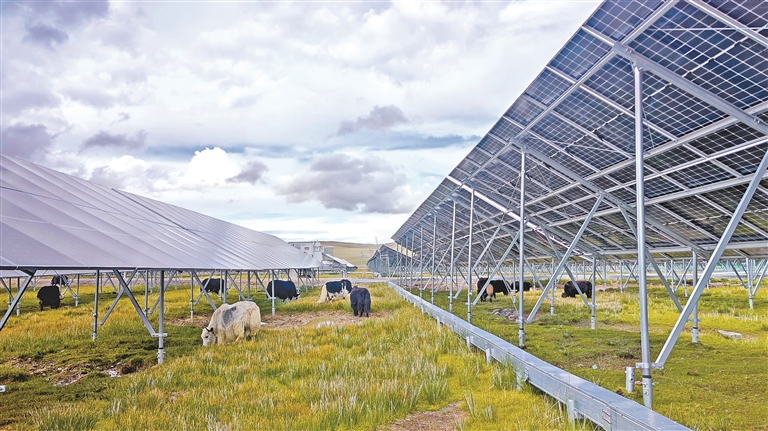 記者了解到,那曲市充分結合牧業(yè)發(fā)展實際情況,以“牧光互補”的形式新建光伏項目,將光伏板高度設置不低于1.8米,不擠占草地,便于牛羊等牲畜覓食休憩,確保放牧與發(fā)電“兩不誤”,促進光伏與畜牧業(yè)高度融合發(fā)展,不僅高效利用了土地資源,而且對帶動群眾增收、推進鄉(xiāng)村振興產(chǎn)生了示范作用。