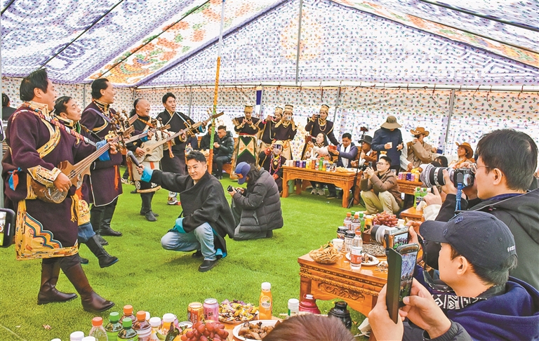 圖為麥巴村群眾以熱情的歌舞和特色美食歡迎遠(yuǎn)道而來(lái)過(guò)工布新年的游客。